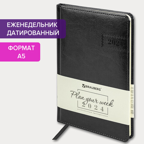 Еженедельник датированный 2024 А5 145х215 мм BRAUBERG "Imperial", под кожу, черный, 115028