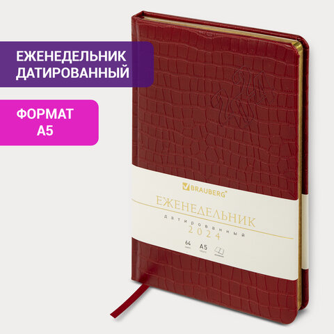 Еженедельник датированный 2024 А5 145х215 мм BRAUBERG "Comodo", под кожу, красный, 115021