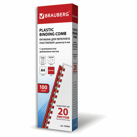 Пружины пластиковые для переплета, КОМПЛЕКТ 100 шт., 6 мм (для сшивания 10-20 л.), красные, BRAUBERG, 530906