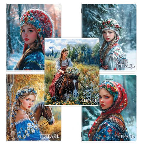 Тетрадь А5, 48 л., BRAUBERG, скоба, клетка, глянцевый лак, Русская красавица (микс в спайке), 405649