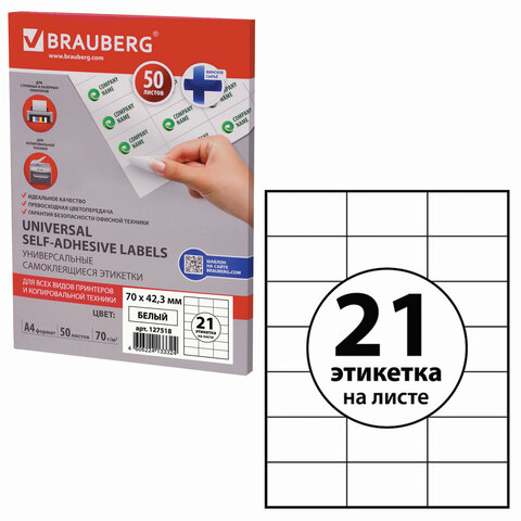 Этикетка самоклеящаяся 70х42,3 мм, 21 этикетка, белая, 70 г/м2, 50 листов, BRAUBERG, сырье Финляндия, 127518
