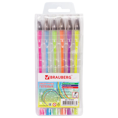 Ручки гелевые BRAUBERG "Jet", НАБОР 6 ЦВЕТОВ, ПАСТЕЛЬНЫЕ, узел 0,7 мм, линия письма 0,5 мм, 141033