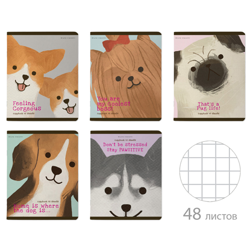 Тетрадь А5 48л " Bruno Visconti " Псы милашки, клетка, офсет, на скобе, обложка- мелованный картон, матовая ламинация Soft Touch, скругленные углы, 5 дизайнов