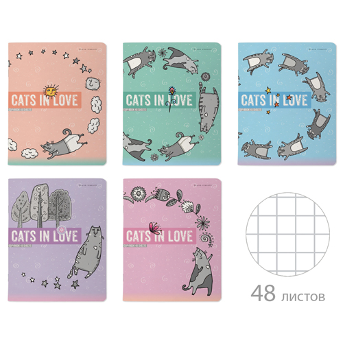 Тетрадь А5 48л " Bruno Visconti " Kats in Love, клетка, офсет, на скобе, обложка- мелованный картон, матовая ламинация Soft Touch, скругленные углы, 5 дизайнов
