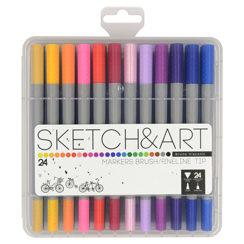 Набор маркеров для скетчинга " Bruno Visconti " 24цв Sketch&Art, двусторонние, 3,0мм, кисточка/линер, трехгранный корпус, в пластиковом боксе