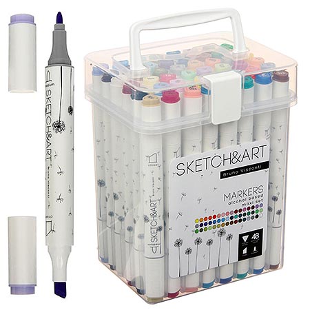 Набор маркеров для скетчинга " Bruno Visconti " 48цв Sketch&Art, двусторонние, 1,0-5,0мм, пулевидный/скошенный, трехгранный корпус, в пластиковом боксе