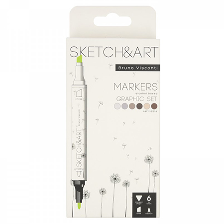 Набор маркеров для скетчинга " Bruno Visconti " 6цв Sketch&Art, Графика, двусторонние, 1,0-5,0мм, пулевидный/скошенный, трехгранный корпус, картонной упаковке