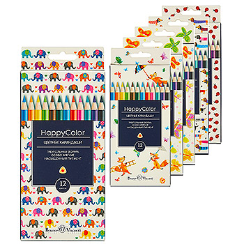 Карандаши " Bruno Visconti " Happycolor 12цв 6 видов (без возможности выбора дизайна), трехгранные, деревянные, картонная упаковка, европодвес