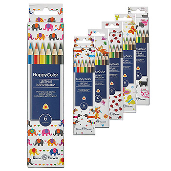Карандаши " Bruno Visconti " Happycolor 6цв 6 видов (без возможности выбора дизайна), трехгранные, деревянные, картонная упаковка, европодвес