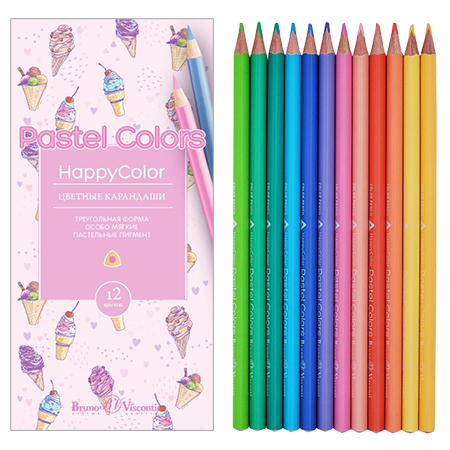 Карандаши " Bruno Visconti " Happycolor Пастельные 12цв 4 вида (без возможности выбора дизайна), трехгранные, деревянные, картонная упаковка, европодвес