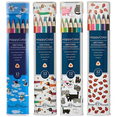 Карандаши " Bruno Visconti " Happycolor 12цв 4 вида (без возможности выбора дизайна), трехгранные, деревянные, металлическая туба