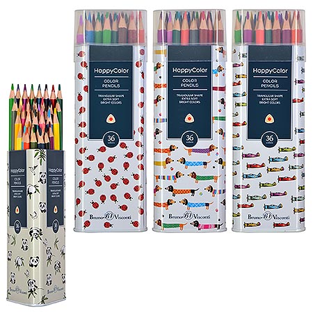 Карандаши " Bruno Visconti " Happycolor 36цв 4 вида (без возможности выбора дизайна), трехгранные, деревянные, металлическая туба