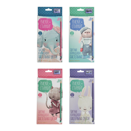 Карандаши " Bruno Visconti " Пастельные 12цв 4 вида (без возможности выбора дизайна), точилка, трехгранные, с ластиком, пластик, картонная упаковка, европодвес