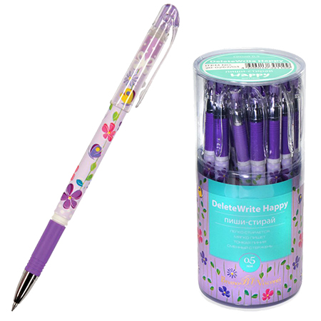 Ручка пиши-стирай " Bruno Visconti " гелевая DeleteWrite Happy. Цветочки, синяя 0,5мм, резиновый держатель, металлизированный наконечник, цвет корпуса- фиолетовый с рисунком, пластиковый бокс