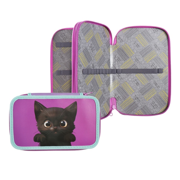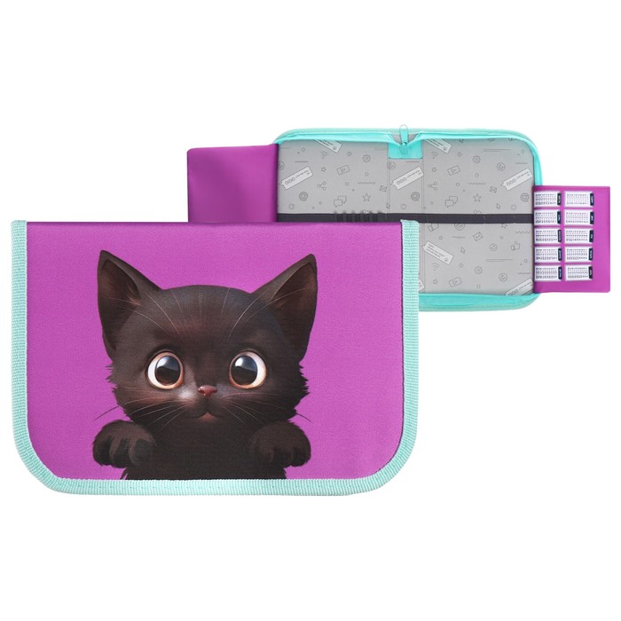 Пенал 1 секция 140 х 210 х 40 мм, откидной карман и косметичка, тканевый, Calligrata TOP Content "Котик"