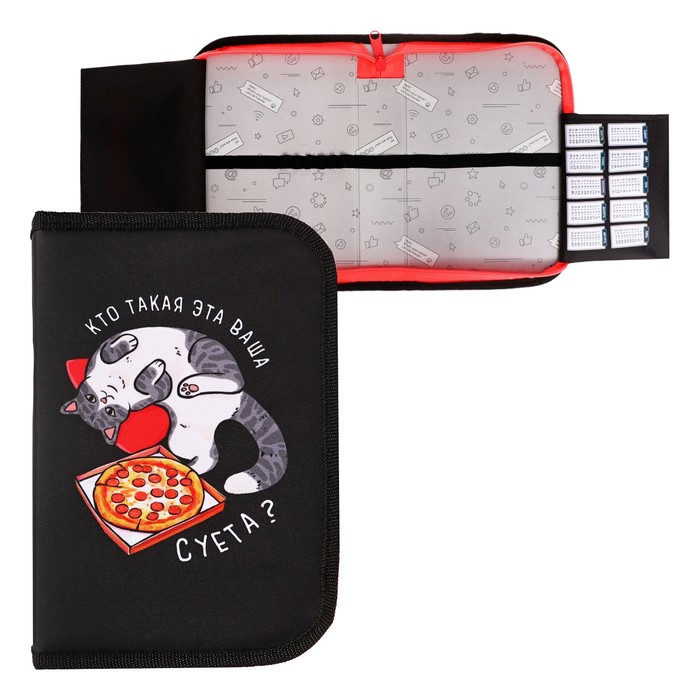 Пенал 1 секция 140 х 210 х 40 мм, откидной карман и косметичка, тканевый, Calligrata TOP Content "Кот суета"