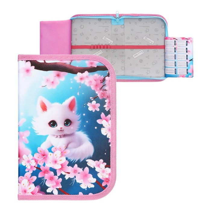 Пенал 1 секция 140 х 210 х 40 мм, откидной карман и косметичка, тканевый, Calligrata TOP Content "Котик сакура"