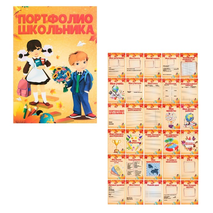 Листы-вкладыши для портфолио школьника, 30 листов (титульный, содержание, 28 разделов ) "Российский школьник", в папке