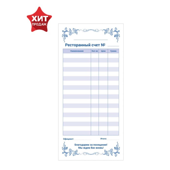 Бланк самокопирующийся "Ресторанный счет" Calligrata, 97х200 мм, 2-слойный, 50 экземпляров, цветной