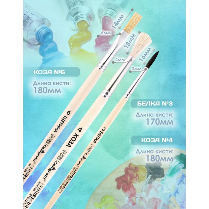 Набор кистей Микс 3 штуки, Calligrata №5 (круглые: Белка № 3, Коза № 4; плоская Щетина № 6), деревянная ручка