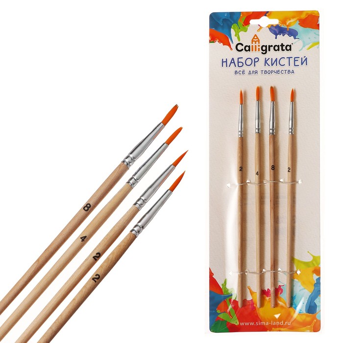 Набор кистей белка, Calligrata, круглые, 4 штук (№2,4,6,8) с деревянными ручками, в блистере