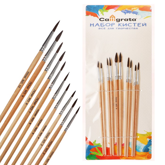Набор кистей коза круглые 10 штук (№1,2,3,4,5,6,7,8,9,10) с деревянными ручками, блистер