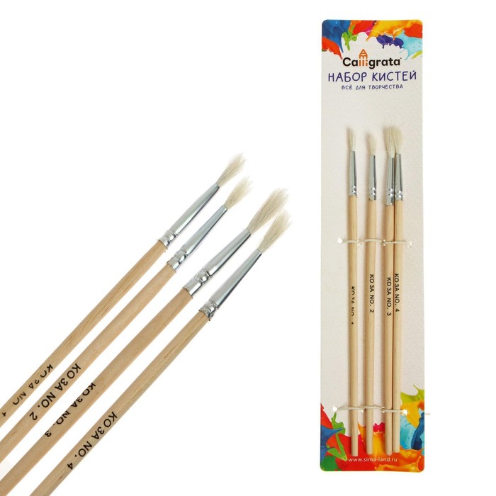Набор кистей ворс "Коза" круглые 4 штуки (№1,2,3,4) с деревянными ручками, блистер