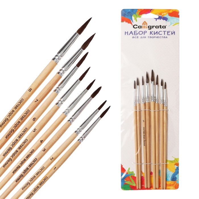 Набор кистей белка, Calligrata, круглые, 6 штук (№2,4,6,8,10,12) с деревянными ручками, в блистере
