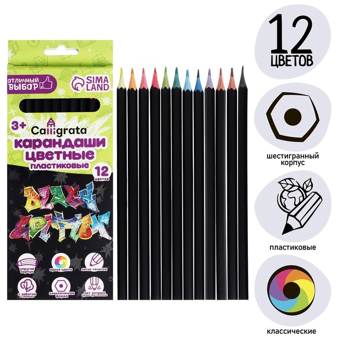Карандаши 12 цветов Calligrata, "Черная серия" заточенные, шестигранные, пластиковые, картонная упаковка, европодвес