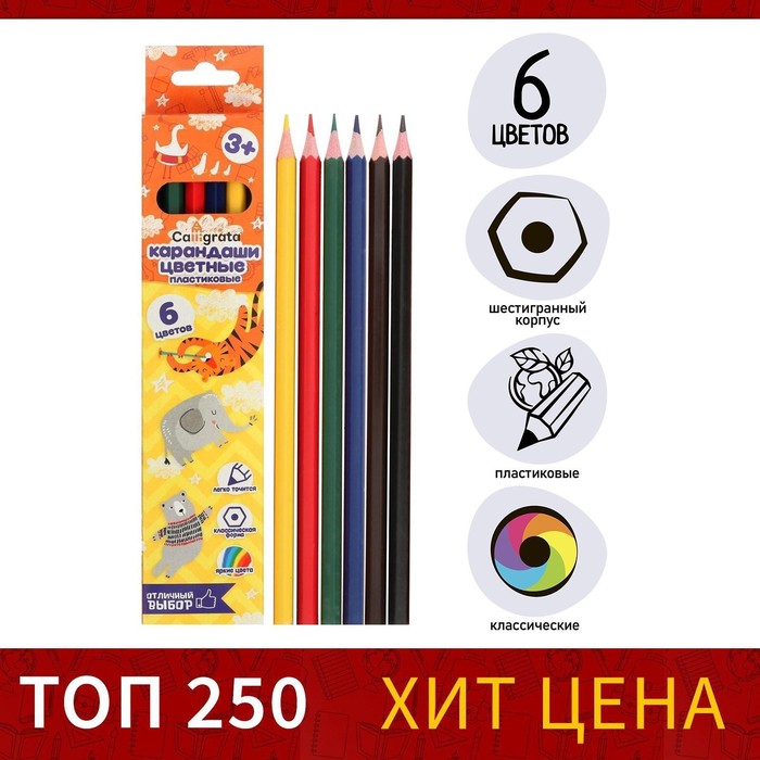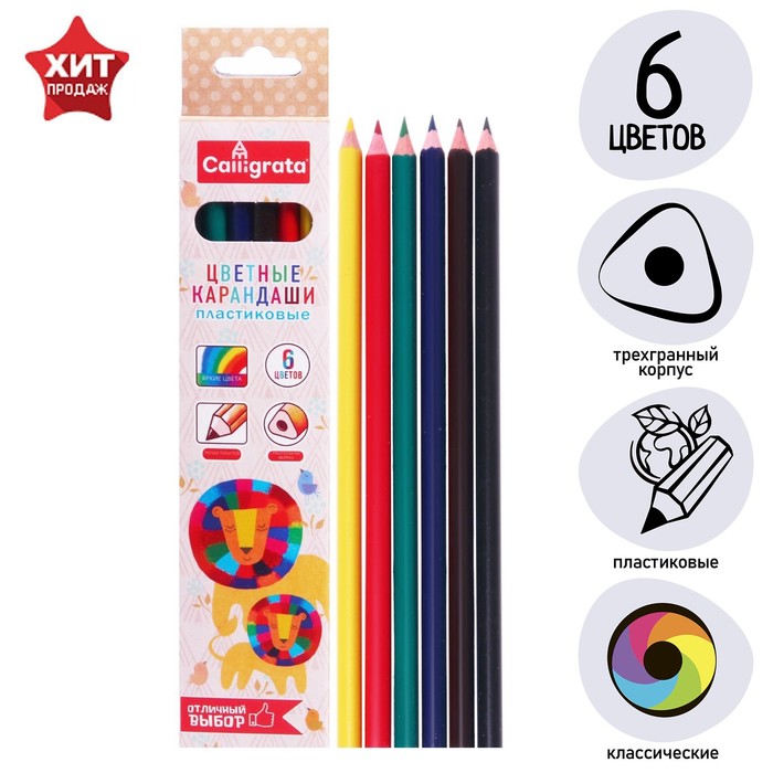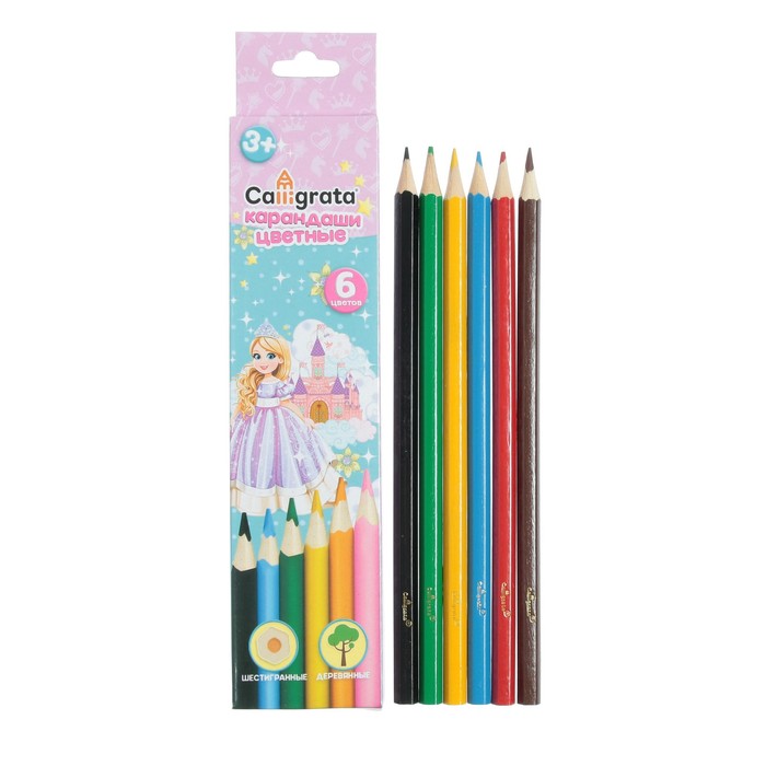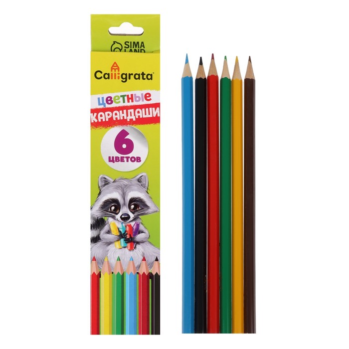 Карандаши 6 цветов Calligrata, заточенные, трехгранные, пластиковые, эконом, картонная упаковка, европодвес