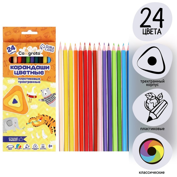 Карандаши 24 цвета Calligrata, заточенные, трехгранные, пластиковые, картонная упаковка, европодвес