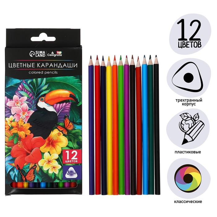 Карандаши 12 цветов Calligrata, заточенные, трехгранные, пластиковые, эконом, картонная упаковка, европодвес