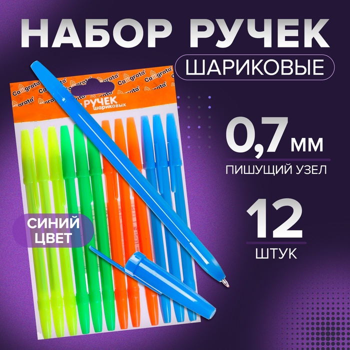 Набор ручек, шариковых 12 штук, стержень 0.7 мм, синий, корпус НЕОН