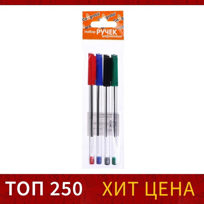 Набор ручек шариковых 4 цвета, стержень 1,0 мм синий, красный, чёрный, зелёный, корпус прозрачный