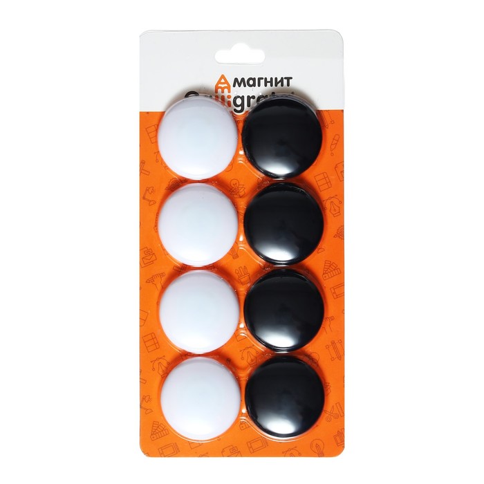 Набор магниты для доски d-4см, 8 штук, на блистере, 4 штуки-белые, 4 штуки-черные