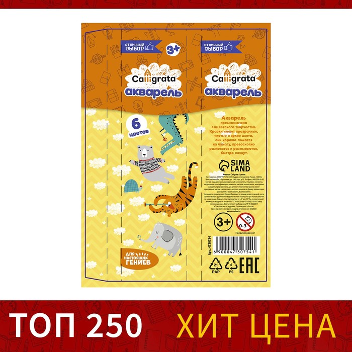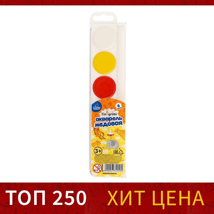 Акварель 6 цветов Calligrata, медовая, без кисти, пластик