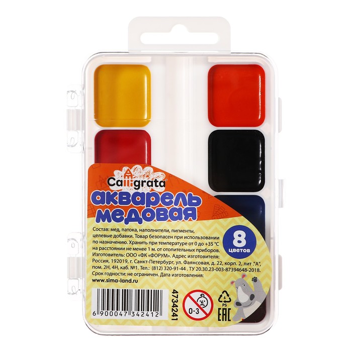 Акварель 8 цветов Calligrata, медовая, без кисти, пластик