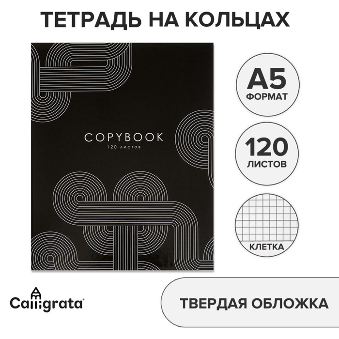 Тетрадь на кольцах A5 160 листов в клетку Calligrata "Графика на чёрном", обложка 7БЦ, без вырубки под кольца, блок офсет