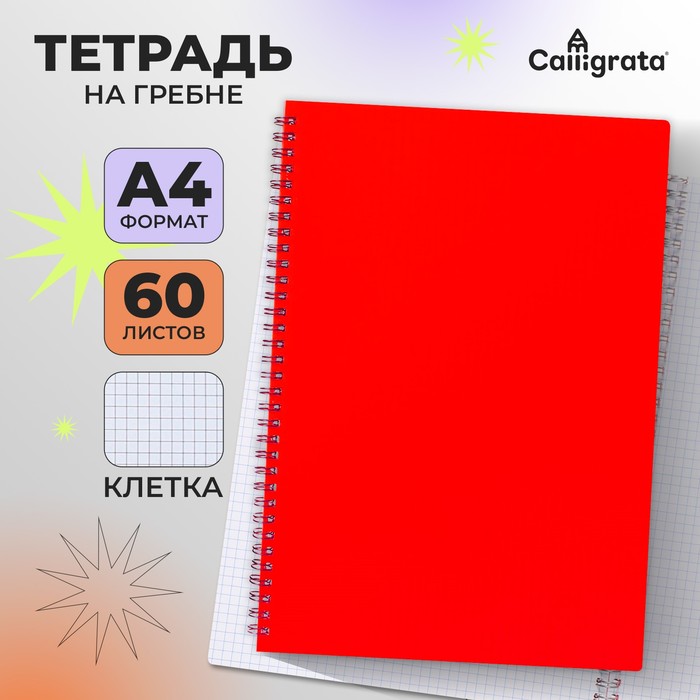 Тетрадь на гребне A4 60 листов в клетку Calligrata Красная, пластиковая обложка, блок офсет