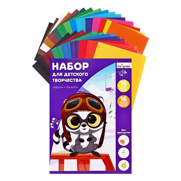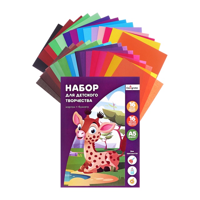 Набор для детского творчества А5 на склейке Calligrata, 16 листов, 16 цветов картон мелованный односторонний 240 г/м2, 16 листов, 16 цветов бумага офсетная, двусторонняя