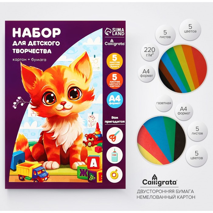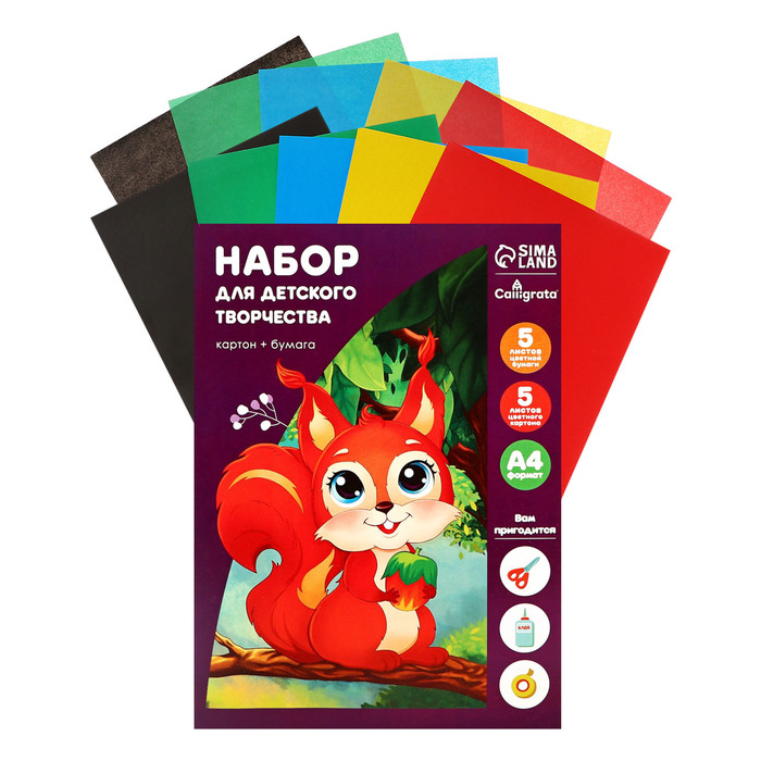 Набор для детского творчества А4, 5 листов картон цветной + 5 листов бумага цветная двусторонняя, Calligrata, в папке, МИКС