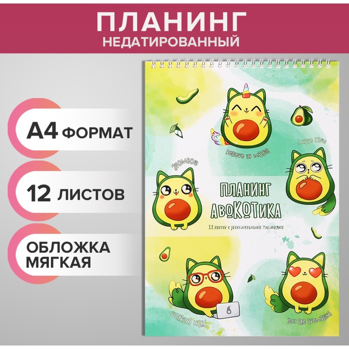 Планинг недатированный А4, 12 листов, на гребне, мягкая обложка, "Планинг авокадика"