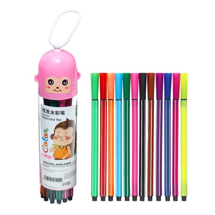 Фломастеры 12 цветов, в тубусе, розовая "Обезьянка"