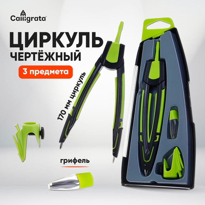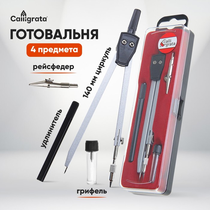 Готовальня Calligrata 4 предмета: циркуль, грифель, удлинитель, рейсфедер, в пластиковом пенале