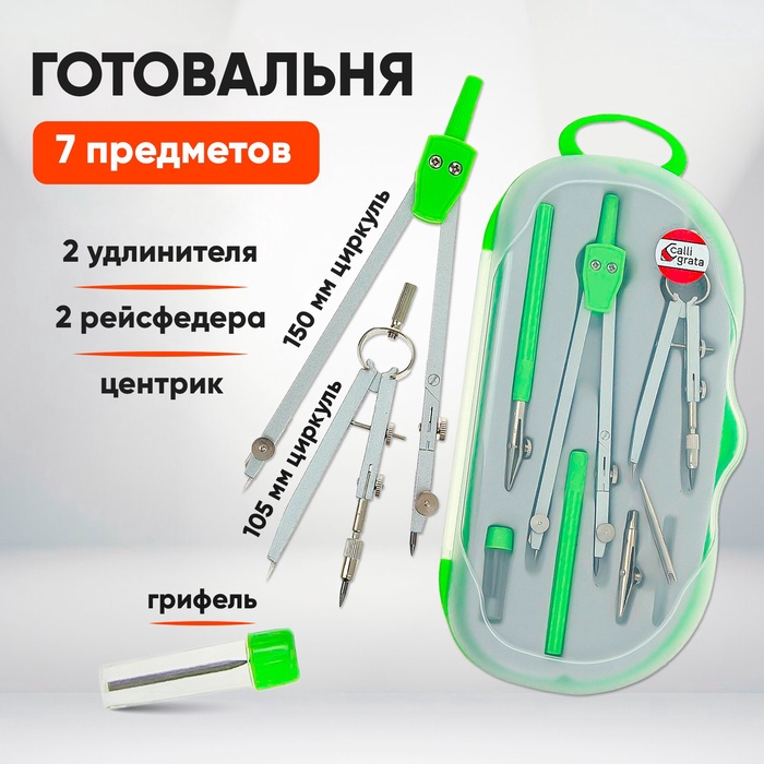 Готовальня Calligrata 6 предметов: циркуль, 2 удлинителя, грифель, 2 рейсфедера, центрик, в пластиковом пенале