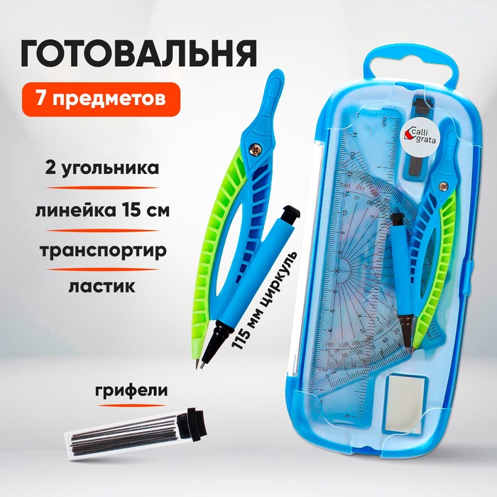 Готовальня 7 предметов (циркуль-115 мм, грифели, ластик, линейка 15см, 2 угольника, транспортир)