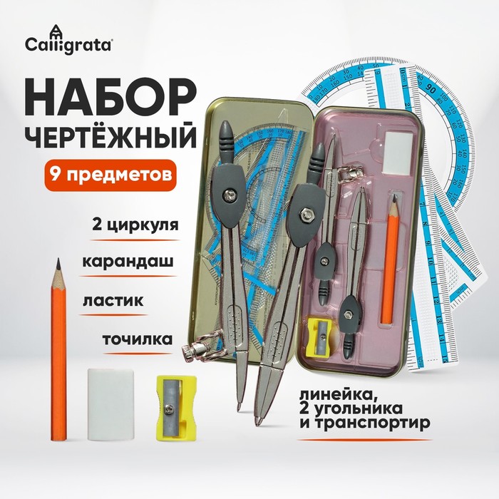 Готовальня 9 предметов: 2 циркуля 120 мм, угольник 60 х 30 х 90 мм, угольник 45 х 45 х 90 мм, линейка 15 см, транспортир, ластик, точилка, в металлическом пенале