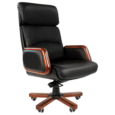 Кресло офисное Chairman СН 408, НАГРУЗКА до 150 кг, дерево, натуральная кожа, черное, 7030084