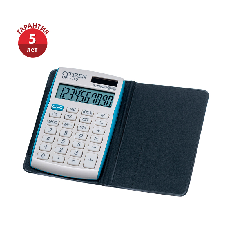 Калькулятор карманный Citizen CPC-110VBL, 10 разрядов, двойное питание, 64*105*10мм, белый/голубой