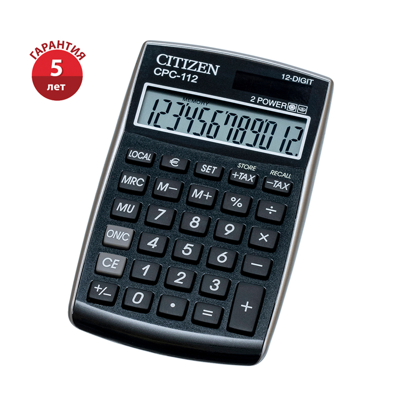 Калькулятор карманный Citizen CPC-112BKWB, 12 разрядов, двойное питание, 72*120*9мм, черный
